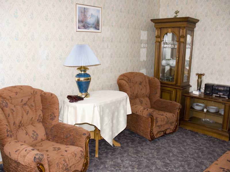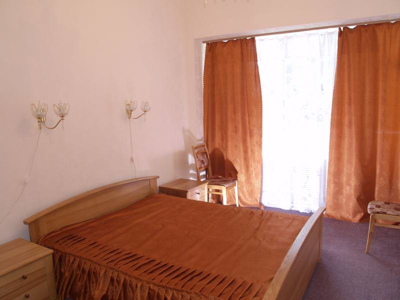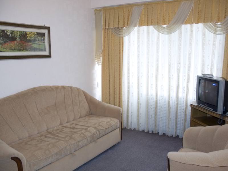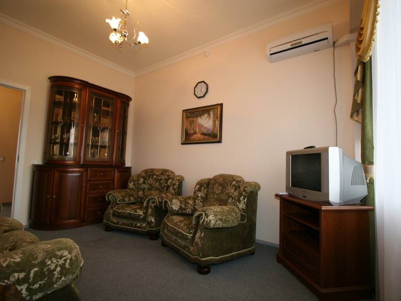 В гостиной имеются диван, сервант, чайник и ТВ. Спальная комната оборудована двуспальной кроватью.