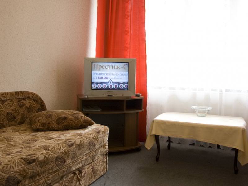 В номере имеются односпальная кровать, холодильник и ТВ.